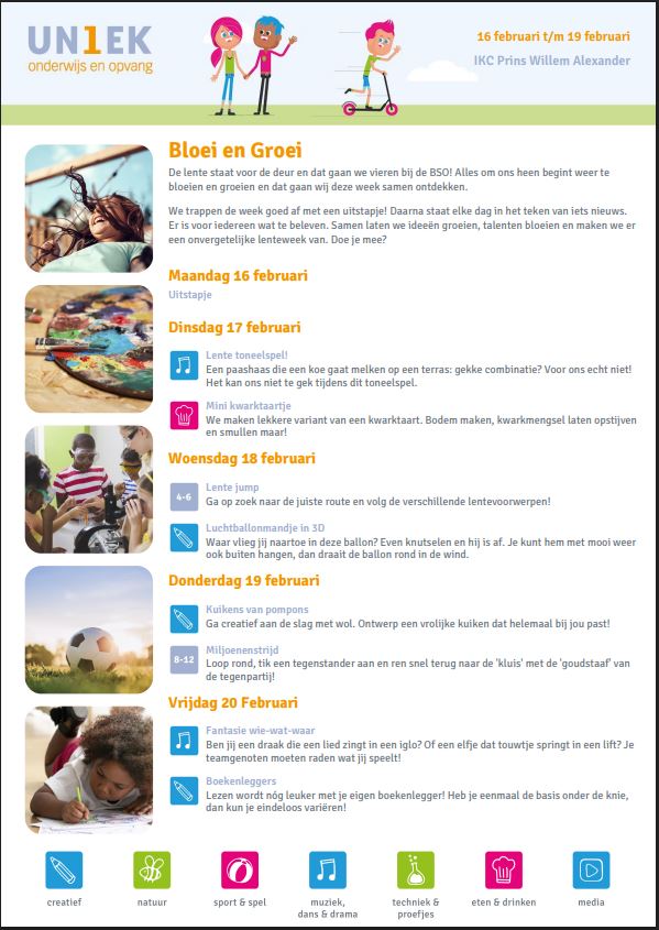 Beste ouders, In de voorjaarvakantie is het bso-programma helemaal afgestemd op de lente: Bloei en Groei. Een uitstapje, toneelspelen, koken, knutselen; er worden weer allemaal leuke dingen gedaan!