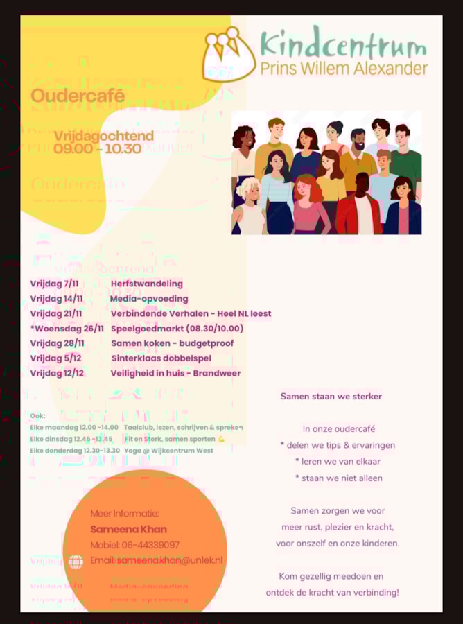 Bekijk berichtHelaas worden alle activiteiten vanuit de ouderkamer afgelast. Dat betekent dat er geen peuterlab is, geen taallessen en